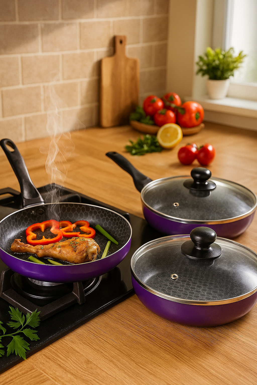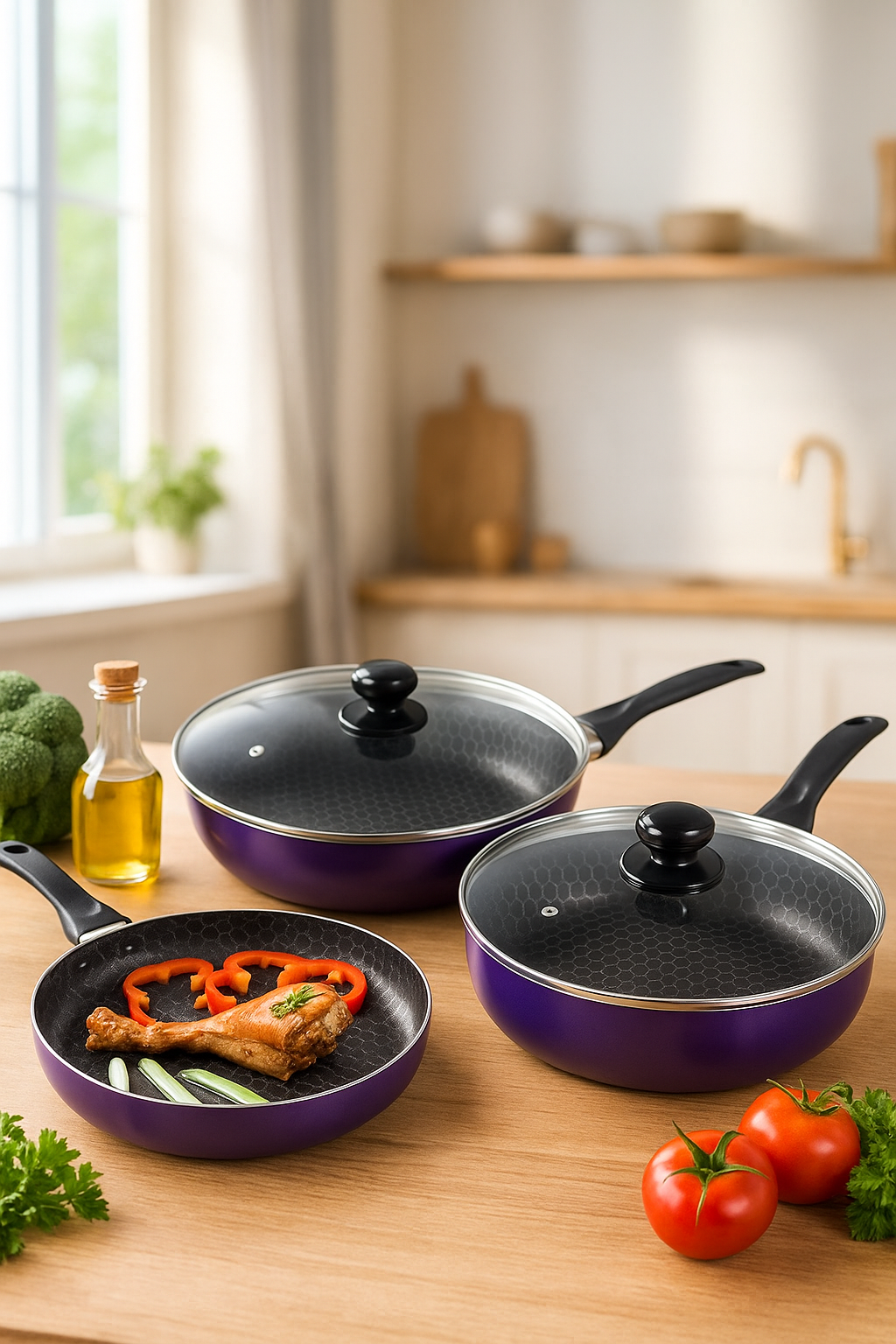 El set incluye tres sartenes de diferentes tamaños, cada uno con una capacidad única. Estas sartenes suelen estar hechas de materiales duraderos como acero inoxidable o revestimientos antiadherentes, lo que garantiza su longevidad y facilita su limpieza.