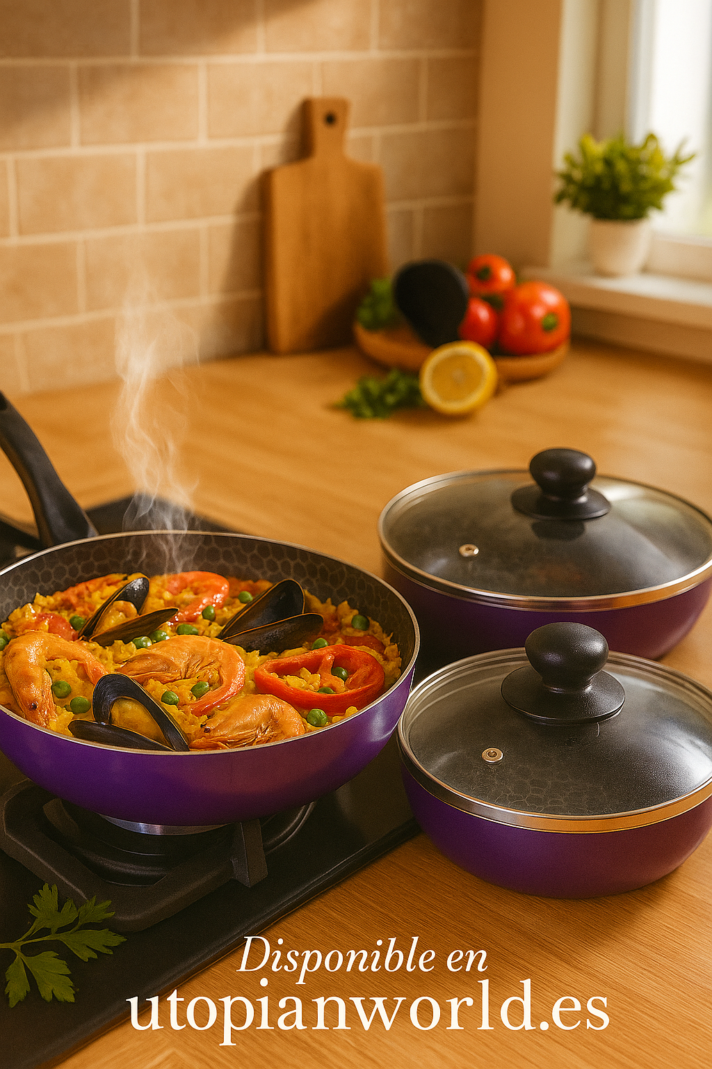 El Spider Pan es un conjunto de utensilios de cocina que consta de tres sartenes y dos tapas. Está diseñado para brindar comodidad y eficiencia en la cocina.